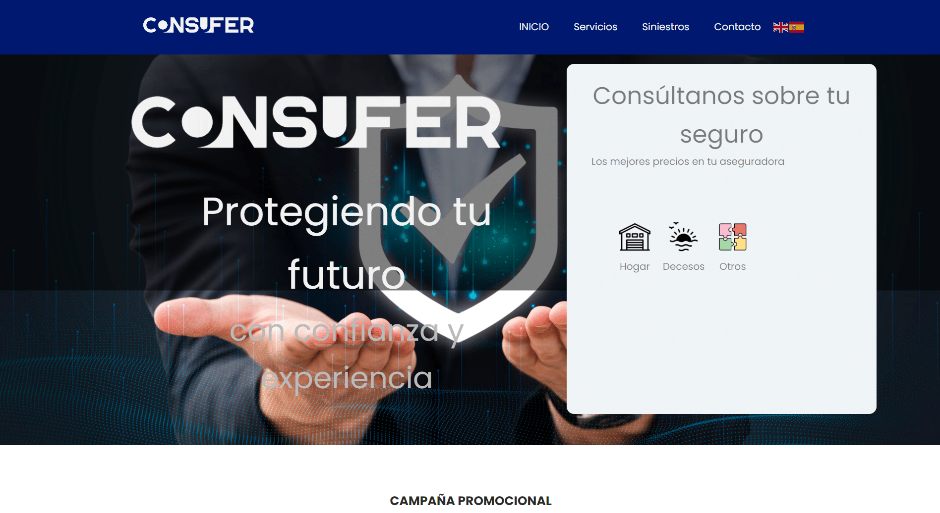 Una web con diseño ligero para consufer, una agencia de seguros. El blanco y el azul (colores que usa la empresa) están presentes en la página.
